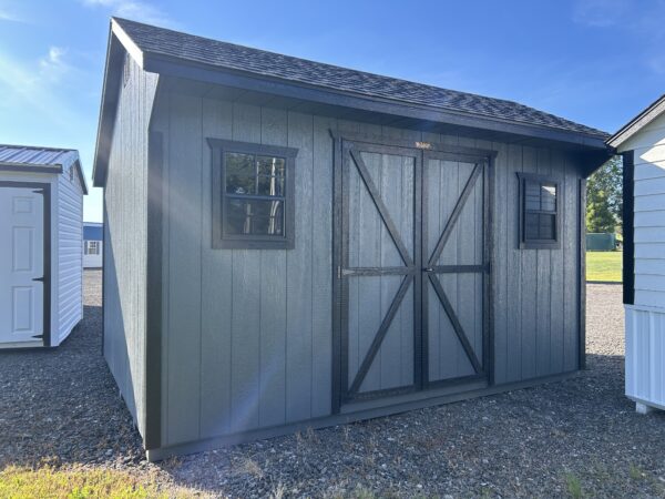 This warm charcoal carriage house is perfect for those who want something a little on the darker side. The black trim really highlights the black windows! Maybe it’s made for a “Man Cave” but that doesn’t mean that us ladies can’t use it too!