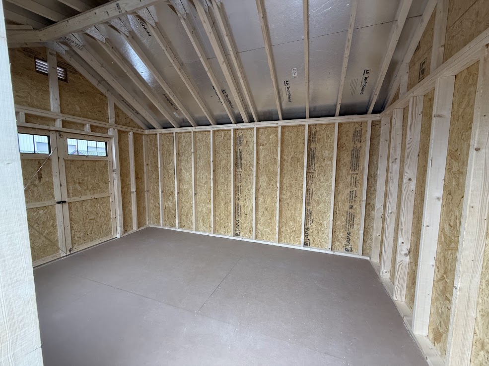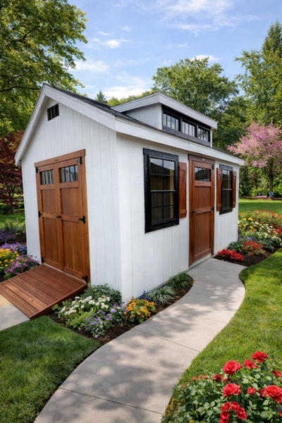 On this 10×14 Nantucket, the doors and “Z” style shutters are beautifully stained in butternut, while the windows and wind trim are finished in black, creating a striking contrast against the crisp, clean white exterior.