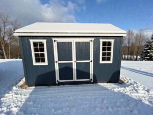 10×14 Gale Force Blue workshop with 7′ walls and a 6/12 pitch. Features (2) 18×36 white windows, and white trim around the windows and doors.