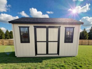 10×14 Clay workshop with 7′ walls and a 6/12 pitch.  Features (2) 18×36 black windows, and black trim around the windows and doors.