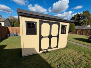 10×14 Almond workshop with 7′ walls and a 6/12 pitch.  Features Dual Black shingles, (2) 18×36 black windows, and black trim around the windows and doors.