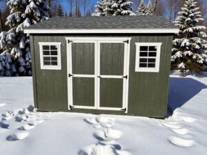 10×14  Olive workshop with 7′ walls and a 6/12 pitch.  Features Weathered Wood shingles, (2) 18×36 white windows, and Neutral trim around the windows and doors.