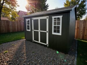 10×14 Ripe Olive workshop with 7′ walls and a 6/12 pitch. Features Weathered Wood shingles, (2) 18×36 white windows, and Neutral trim around the windows and doors.