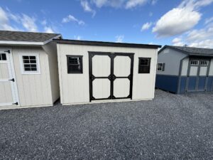 Neutral LP Smartside siding with Black trim and Black shingles.  Features (2) 18×23 black windows, and a 6′ double door.
