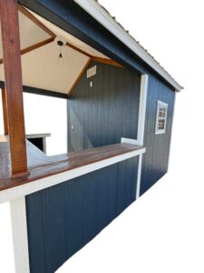 This 10×14 Cabana in Gale Force Blue would make a great addition to your backyard! White and butternut stain accents highlight the dark blue, and we have added an outlet and bracing to hang your television to entertain guests sitting at the bar and a beautiful overhead light. The 6×12 storage area also has electricity.