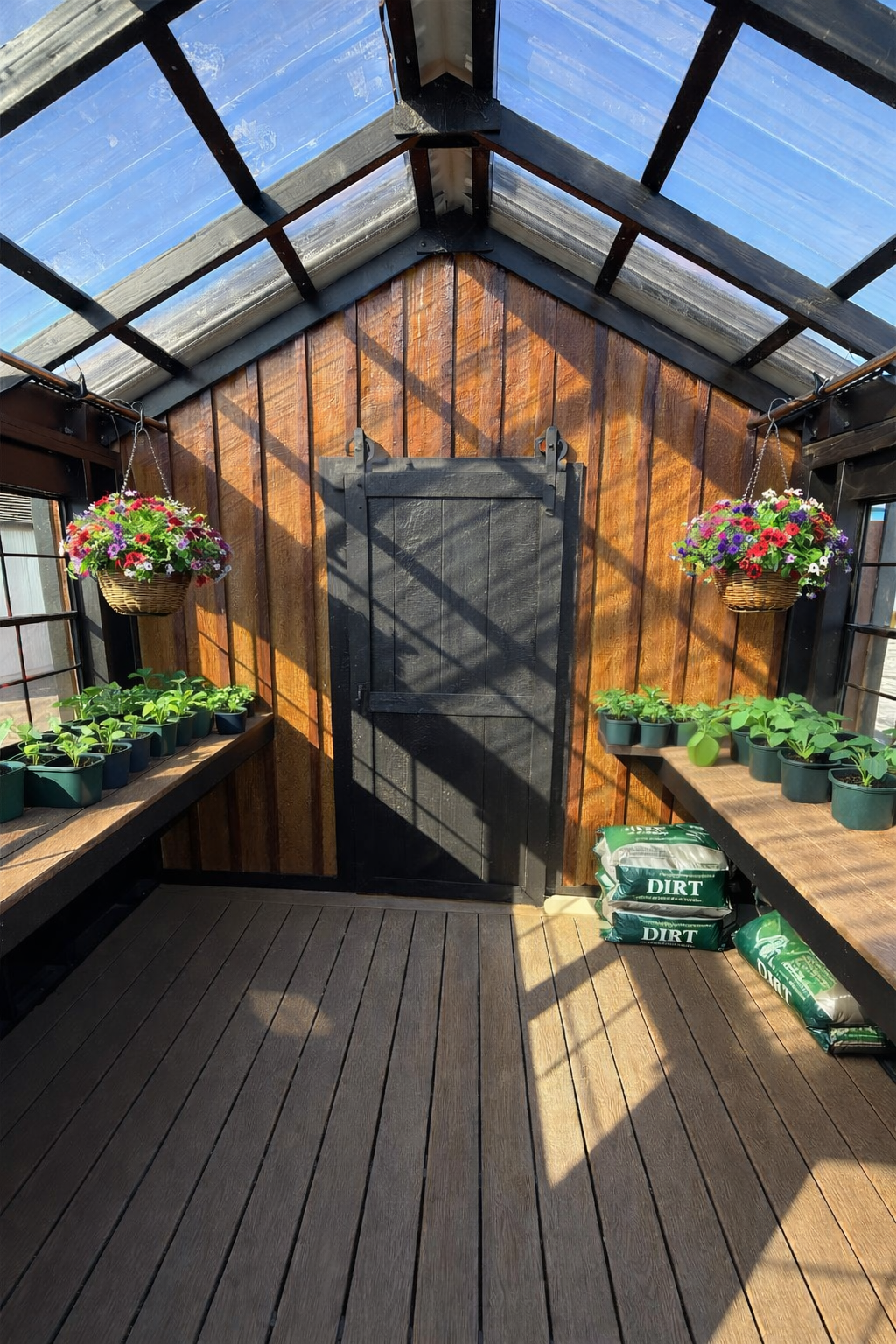 Inside the 10×10 greenhouse, you’ll find plenty of room for all your potting necessities, along with storage for extra soil and potting materials. With two bars for hanging pots and a 2-foot-wide potting bench crafted from Trex decking to match the floor, it’s both functional and stylish. The greenhouse features Poly Carbon panels, allowing an abundance of light and warmth to flow in, while (11) 24×36 black windows provide excellent ventilation and air circulation.