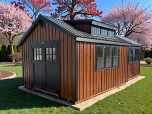 This striking LP Board and Batten Nantucket greenhouse combo, adorned in a butternut stain with black trim, black windows, and a black metal door, is sure to enhance your outdoor space.