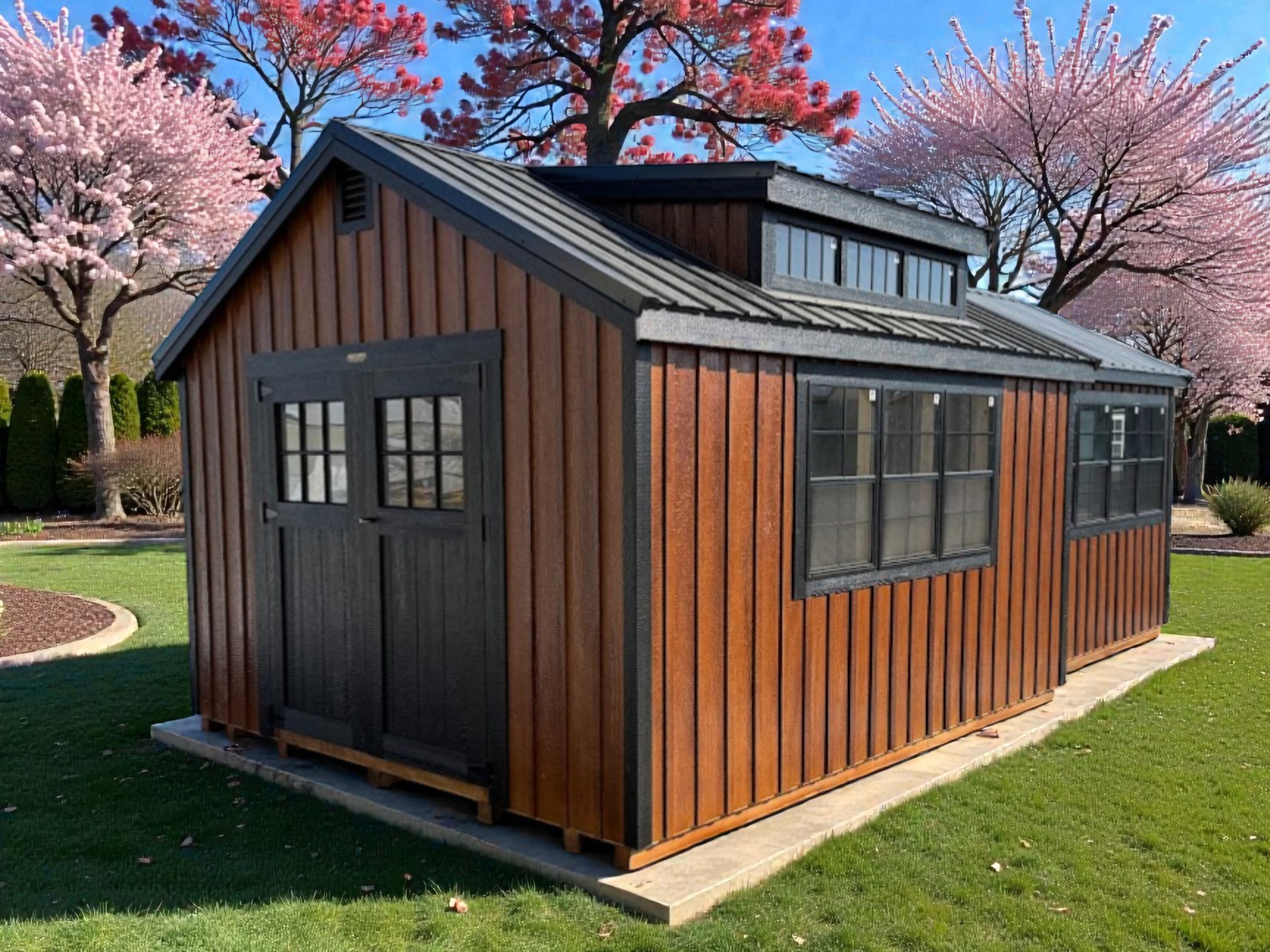 The 12×14 Nantucket also boasts black transom windows above (3) 24×36 windows and a 6-foot door with windows on the gable end.