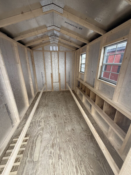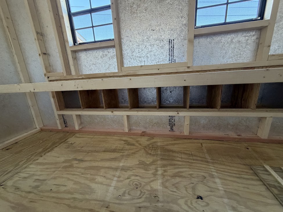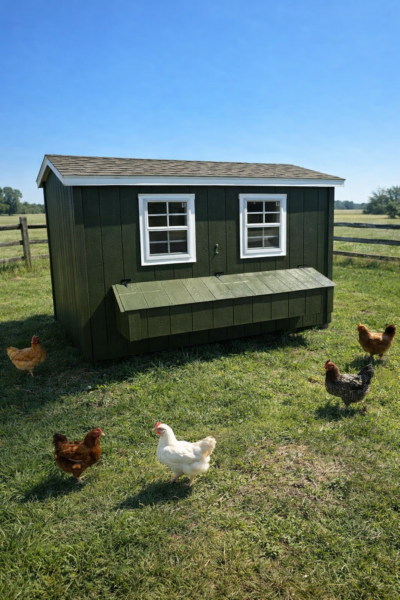 Our 6×10 Chicken Clubhouse has 8 nesting boxes, a large 10′ roost, (2) 18×23 windows, vent, a chicken door w/ a ramp and a regular door.