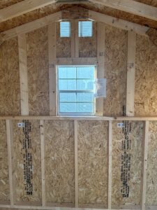 Regular barn with gray siding, white trim, and gray shingles. This barn also has an 18×23 window in the back wall.
