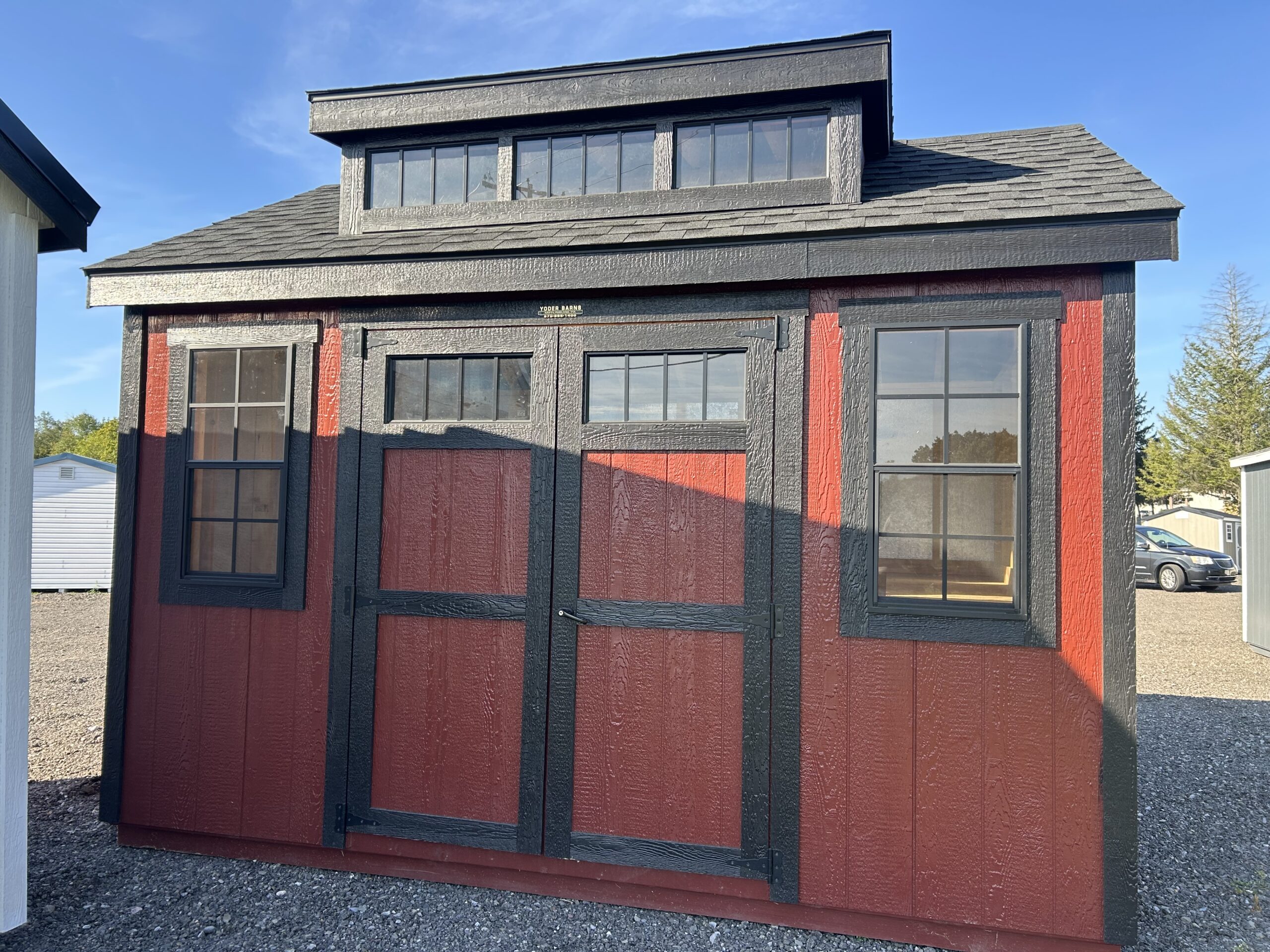 10x12 Nantucket features 3 window dormer, double doors with transom windows, 6/12 roof pitch, 7’ exterior walls, 2 windows and this specific building has a...
