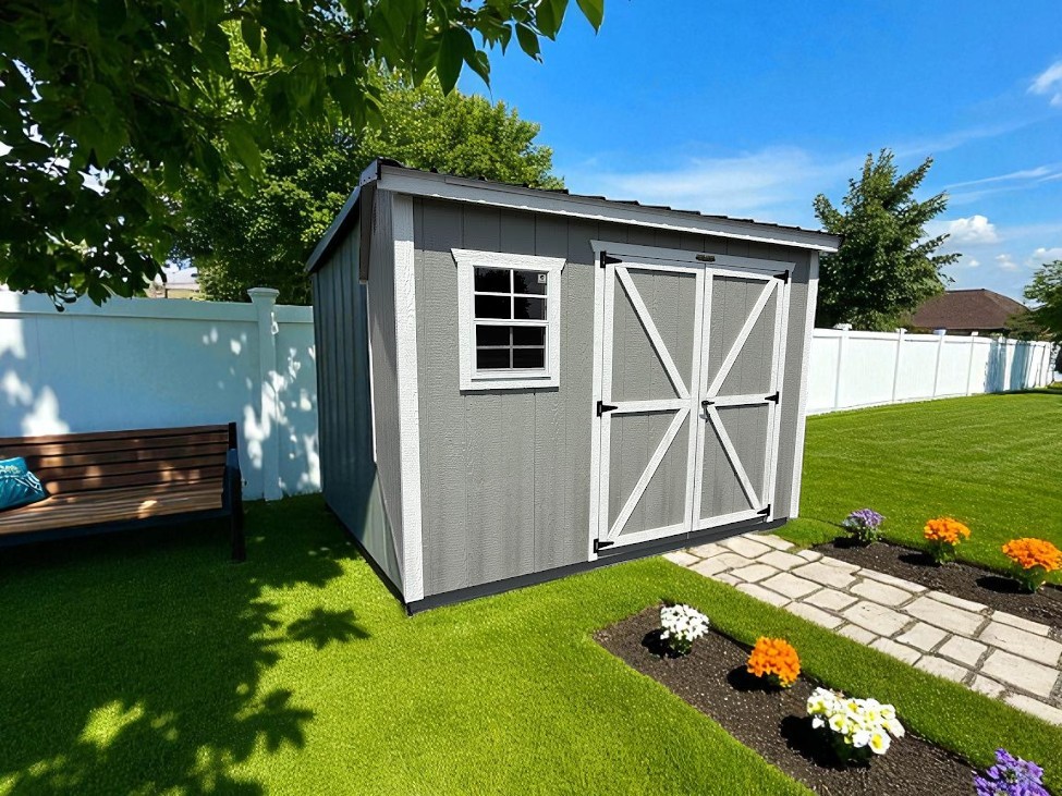 10x10 Gray Workshop with White Trim and Black Metal Roof. Features 7' walls, a 5' Double door and (1) 18x23 white window