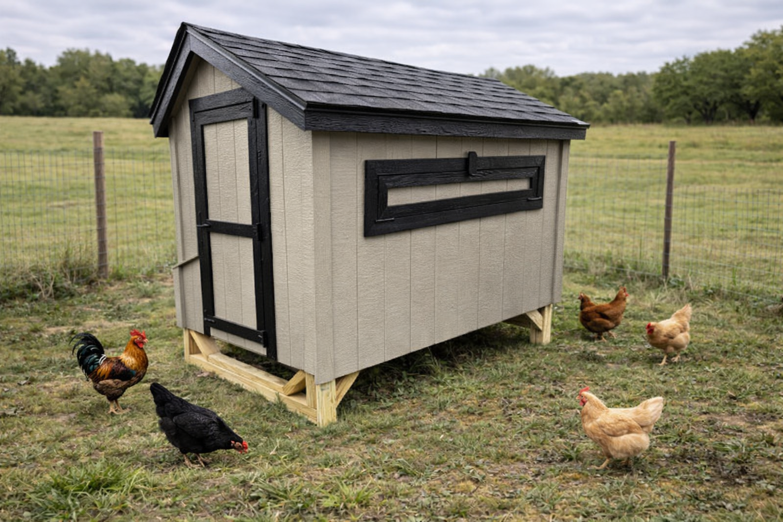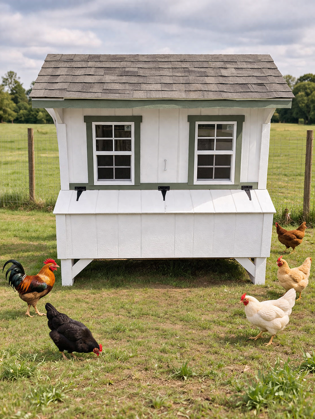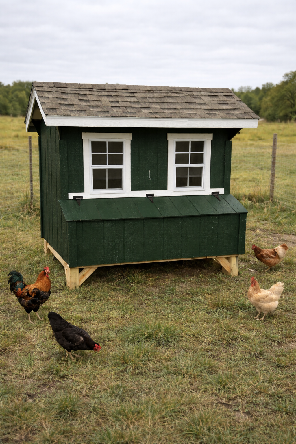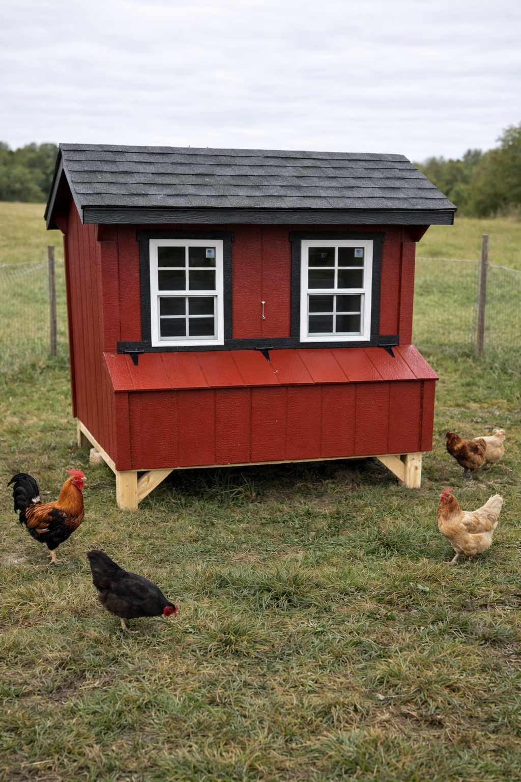 Our 5x6 Quaker Chicken Coop's have 2 windows, a drop vent, a chicken door w/ a ramp, 5 nesting boxes (with outside access), a roost...